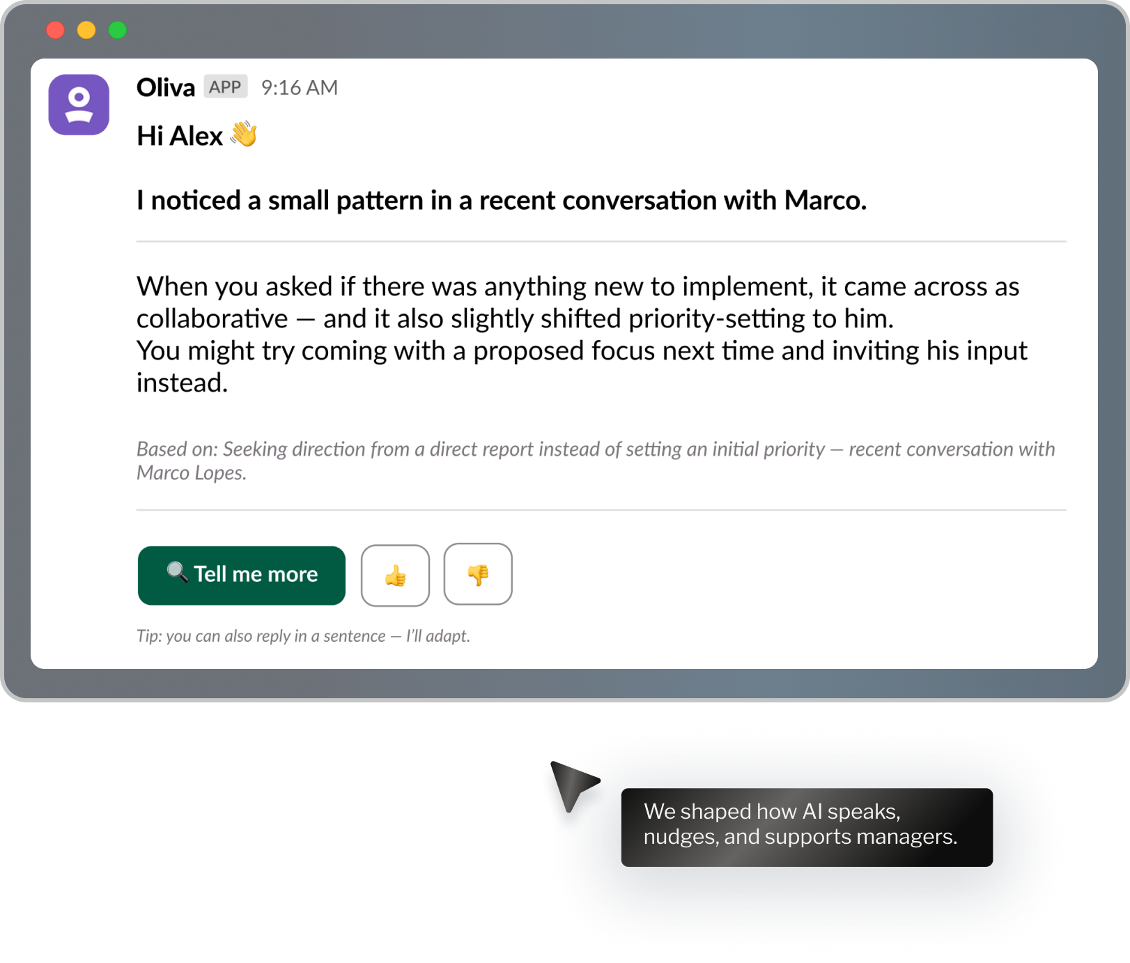Managers already work in Slack. We designed how AI fits naturally into that flow — without becoming another dashboard.