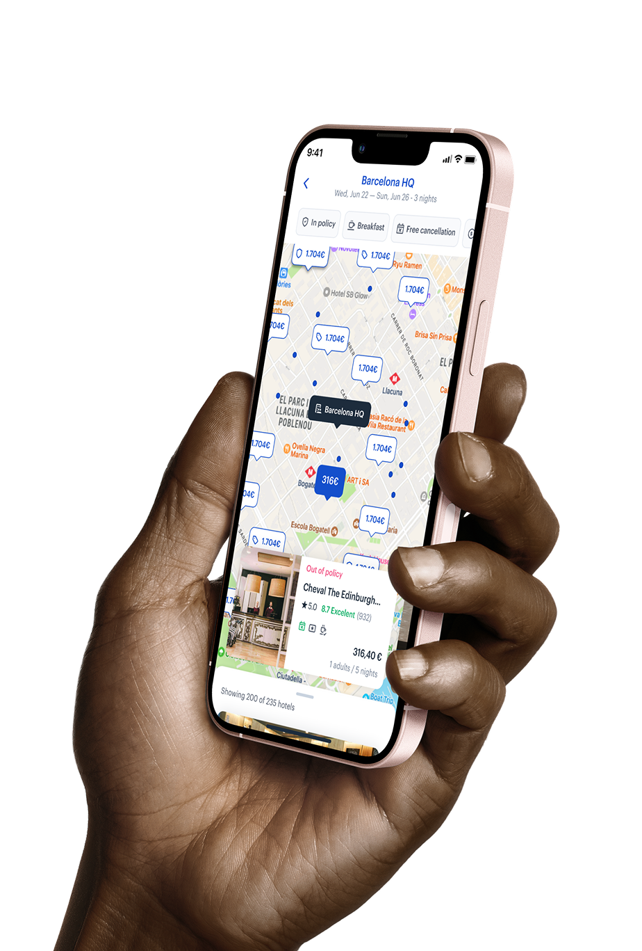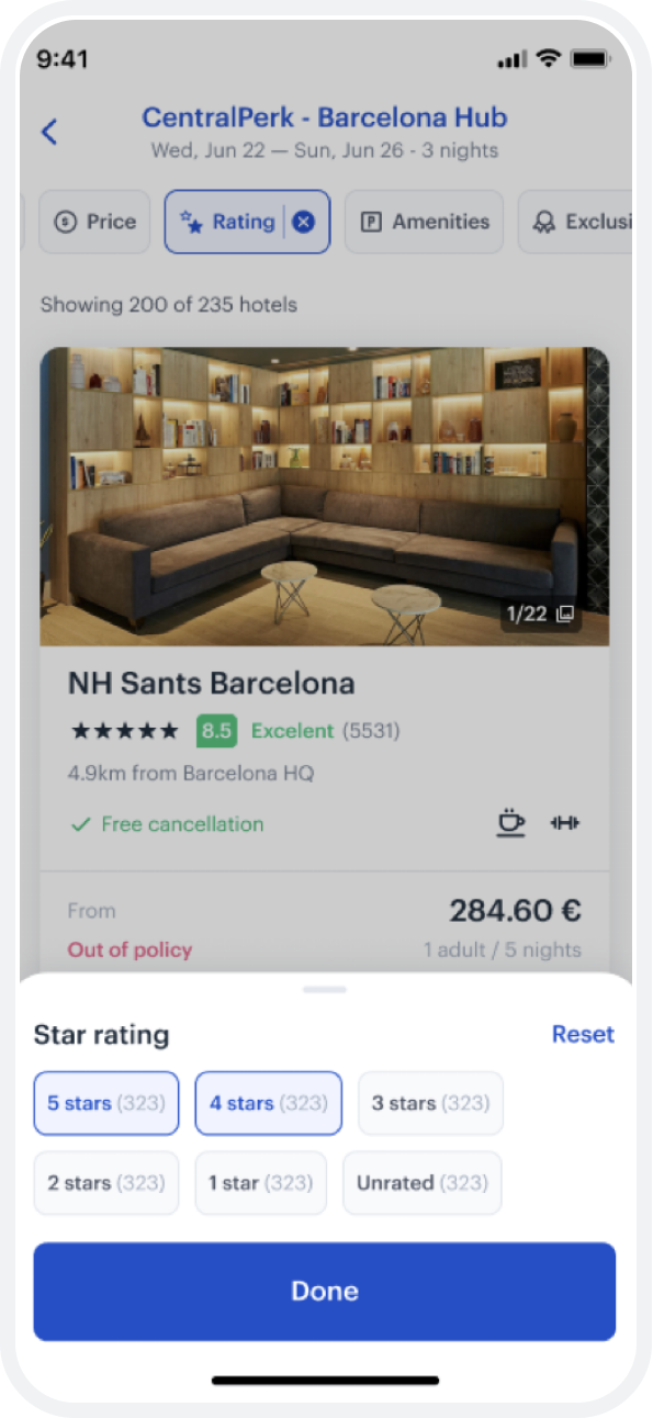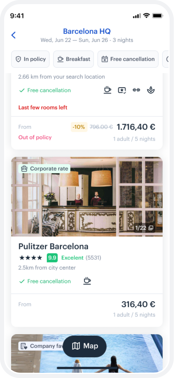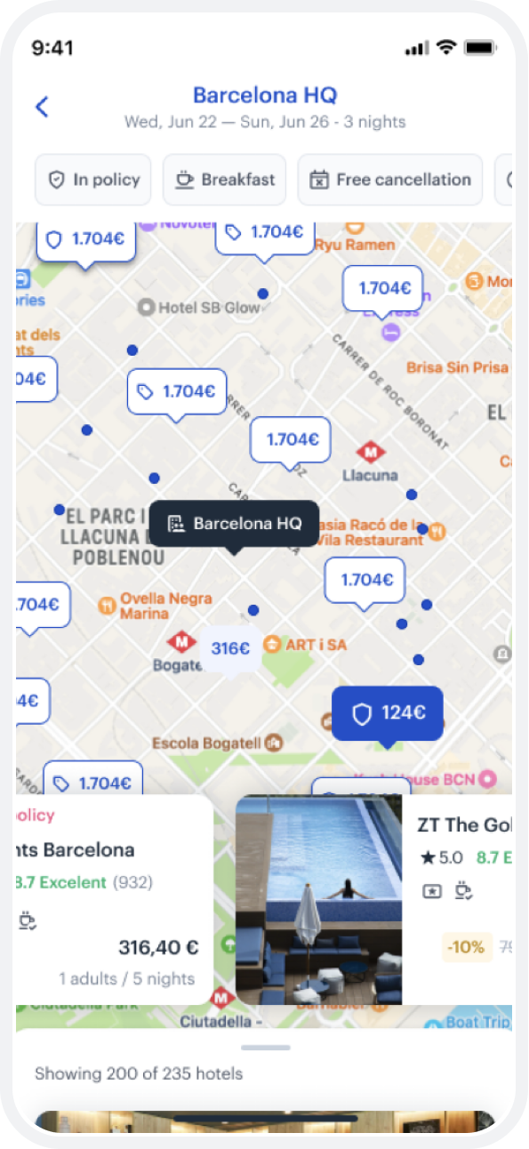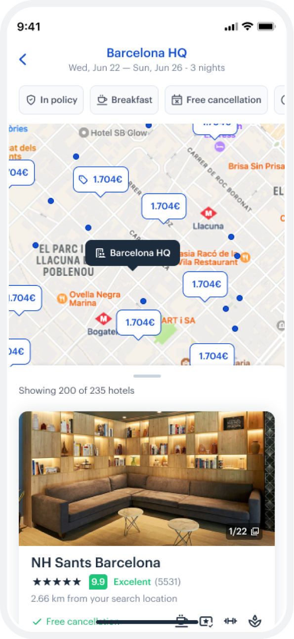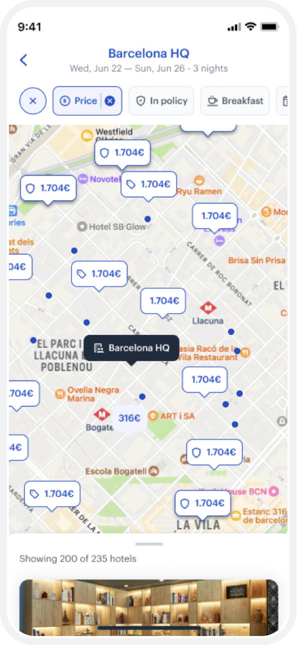 You can see from the design, the company office is automatically setting the context of the search, and the user is getting a map first experience. As the user moves around the map, the hotel options also change, and visa-versa. This simplicity and elegance is what users expect.