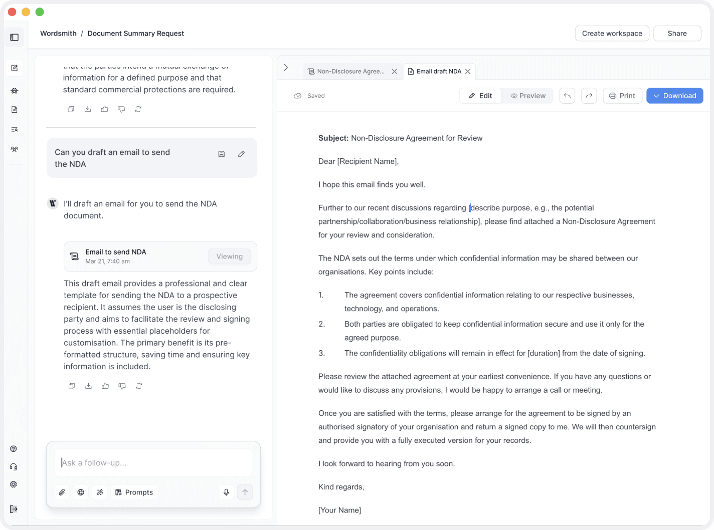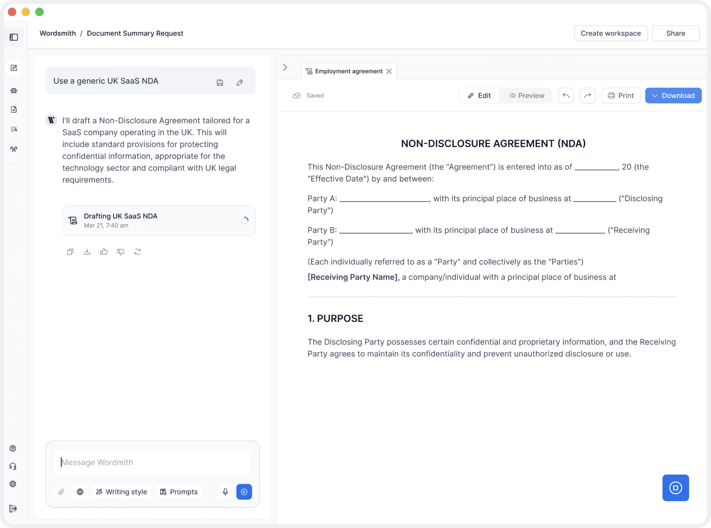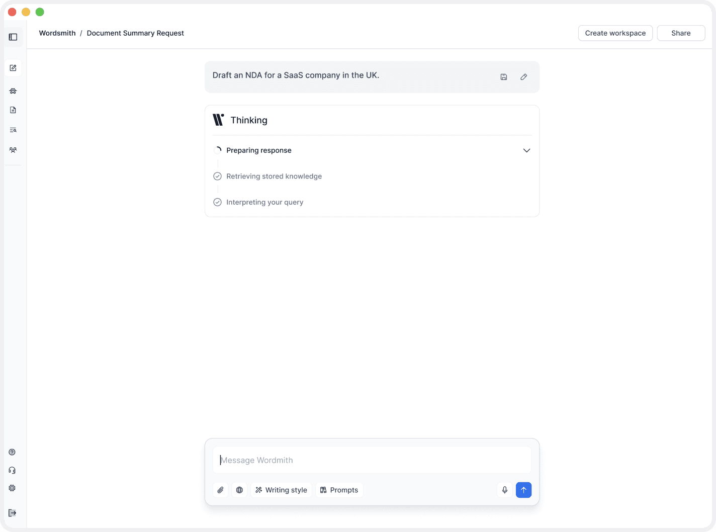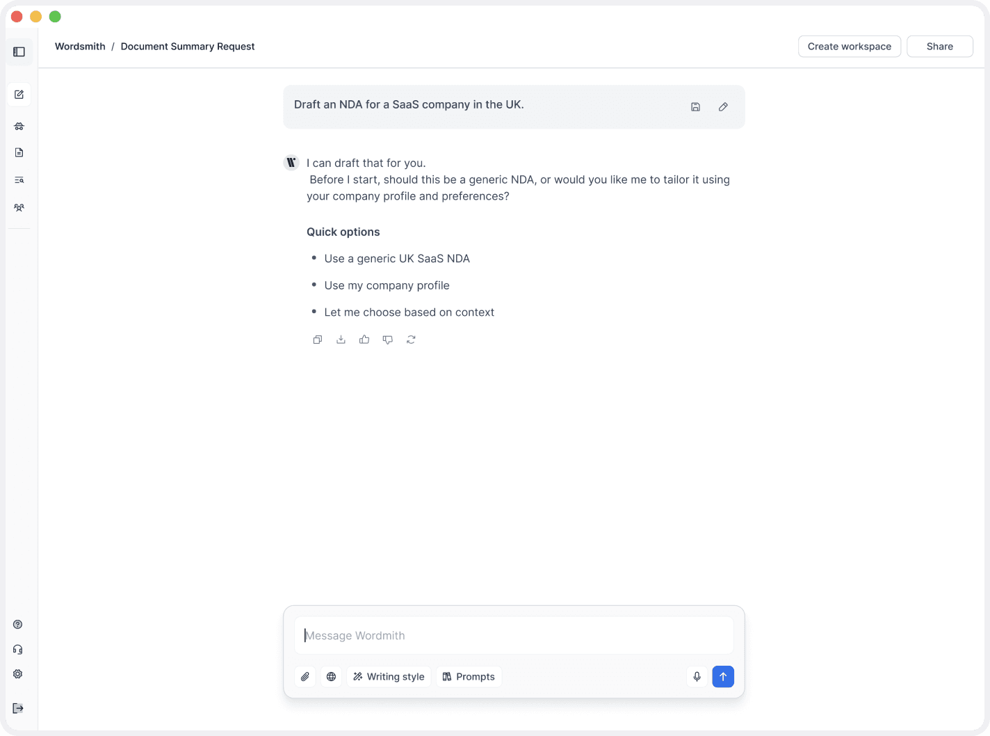 The user starts by describing what they need in plain language. Before drafting, Wordsmith asks a small number of targeted questions to make sure the document is accurate, contextual, and legally appropriate.