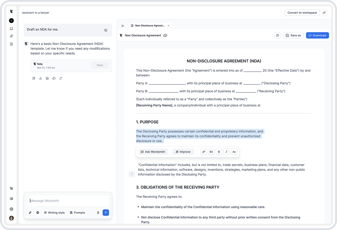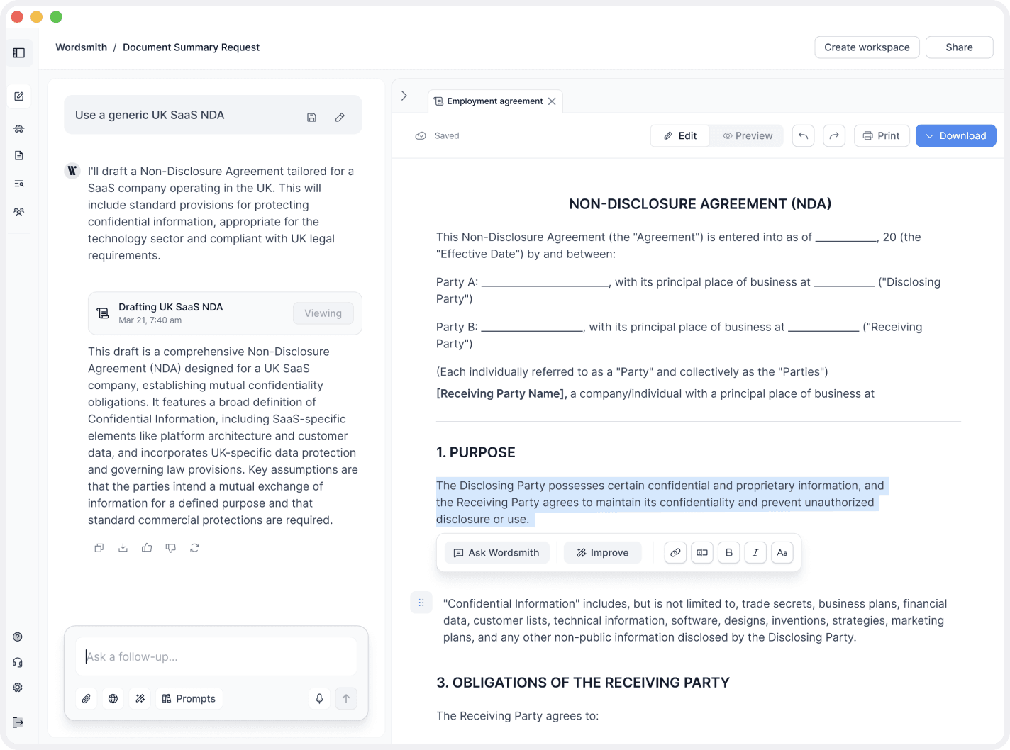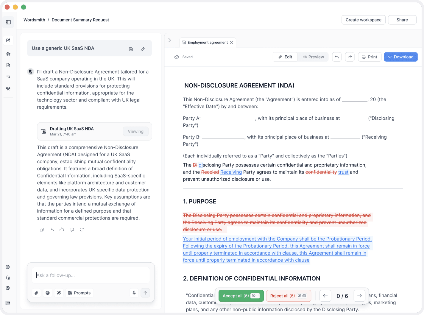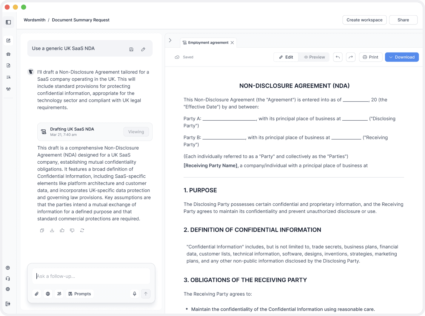The user starts by describing what they need in plain language. Before drafting, Wordsmith asks a small number of targeted questions to make sure the document is accurate, contextual, and legally appropriate.