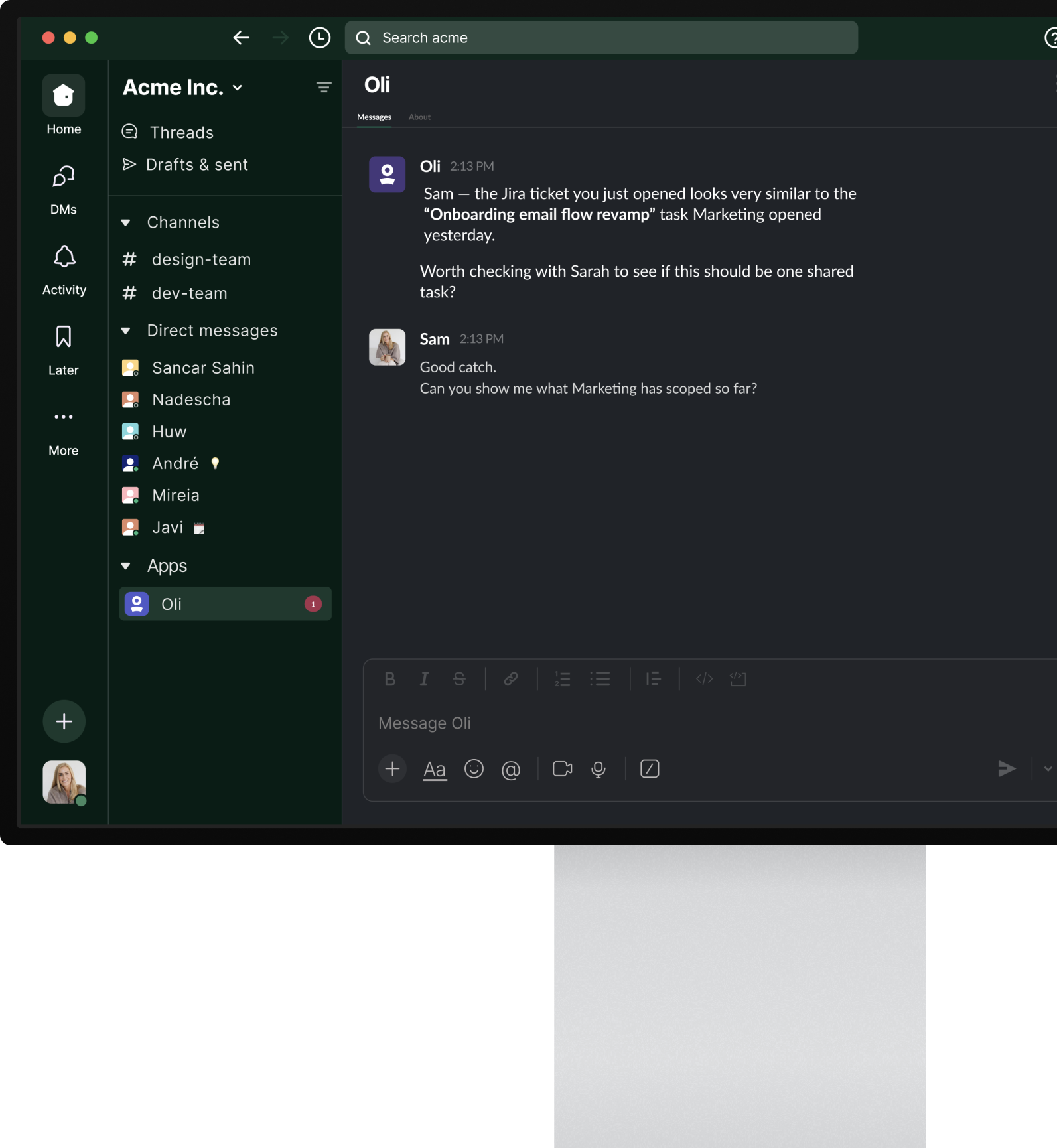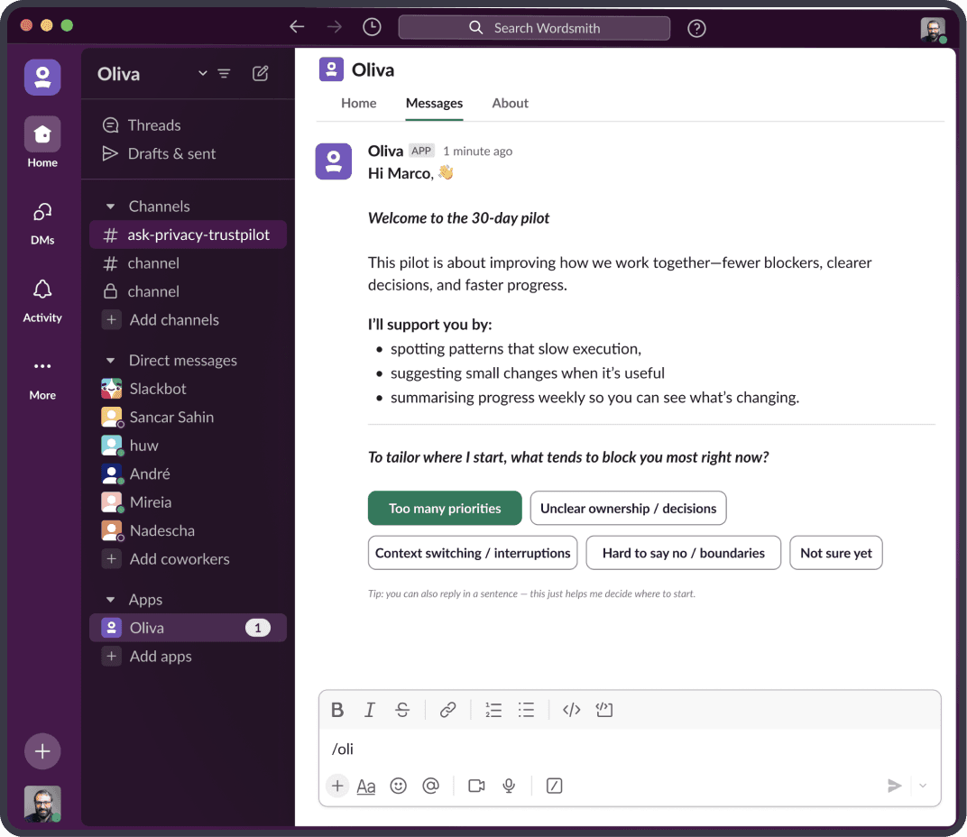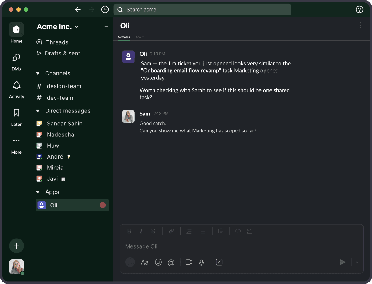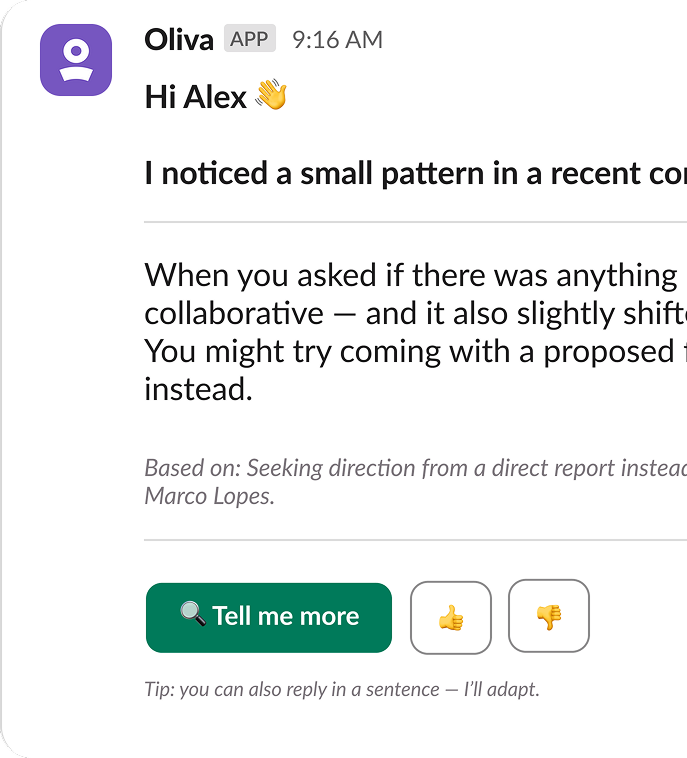 Designed the structure, formatting, and interaction patterns of Oli's Slack messages—shaping how AI insights appear in real team conversations.