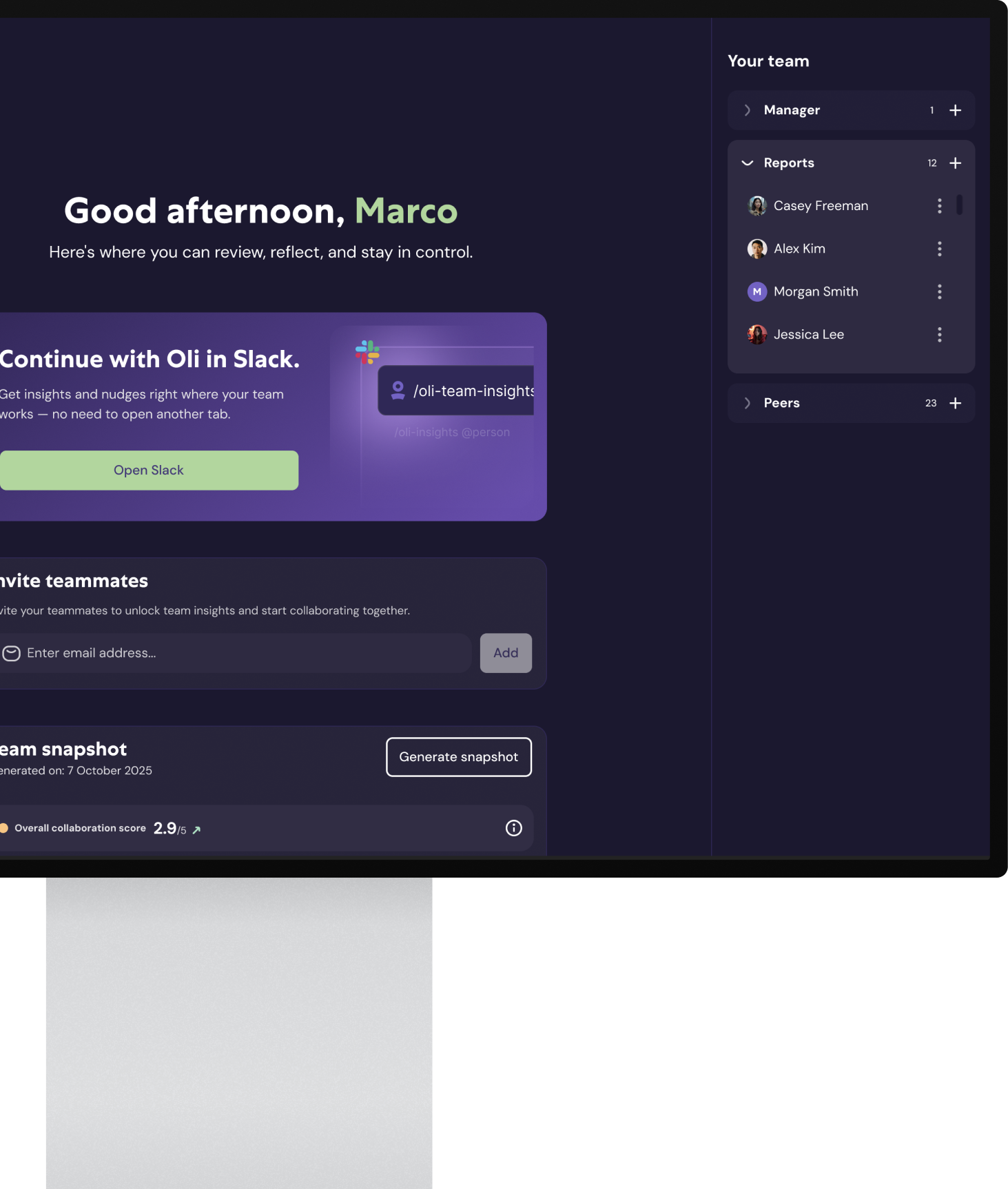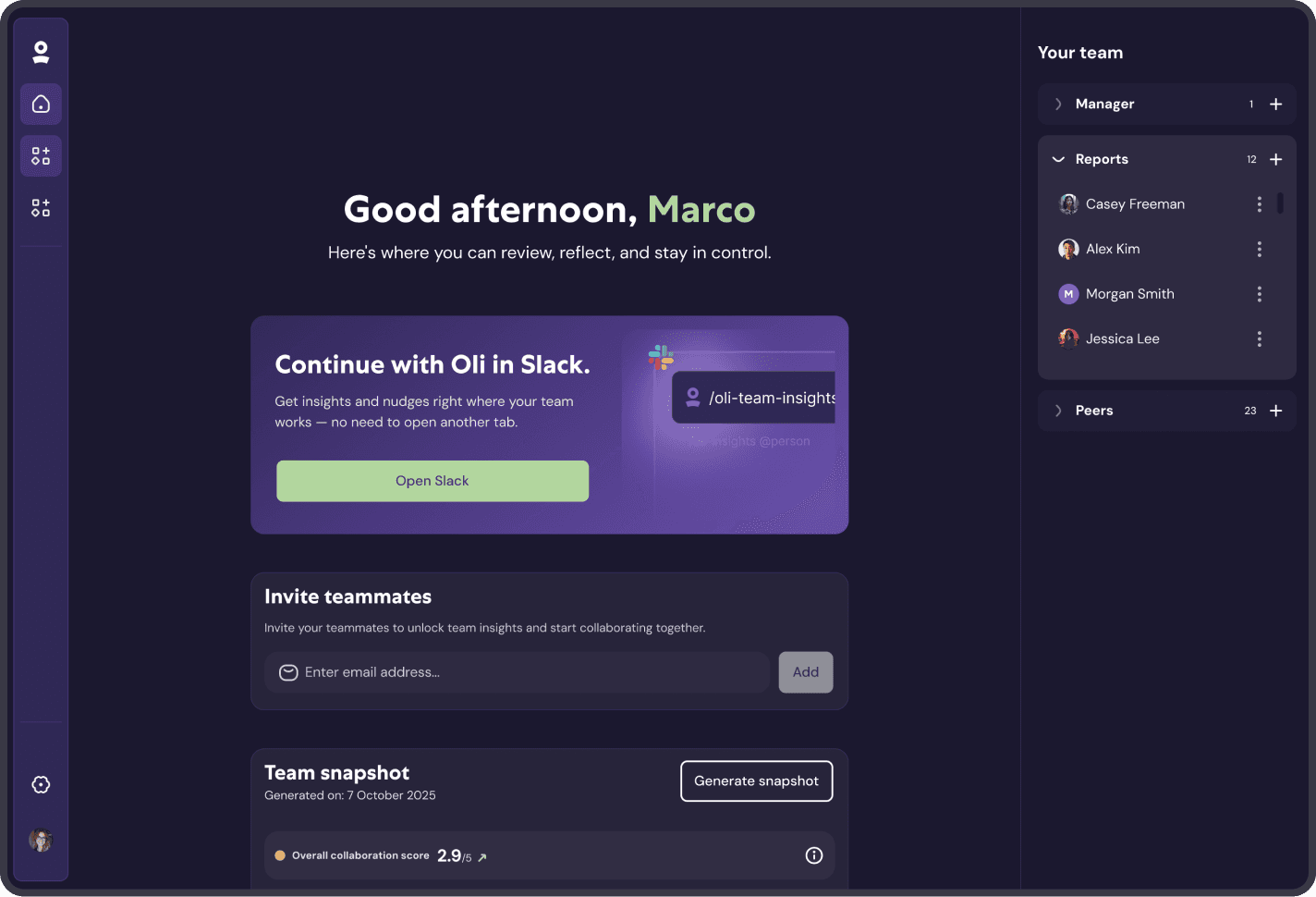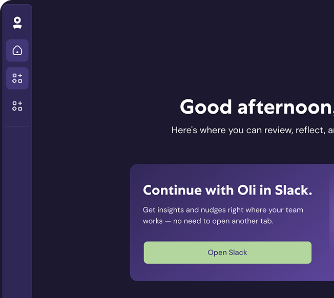A personalized home where managers review insights, invite teammates, and continue with Oli in Slack—with a clear view of their team structure and collaboration.