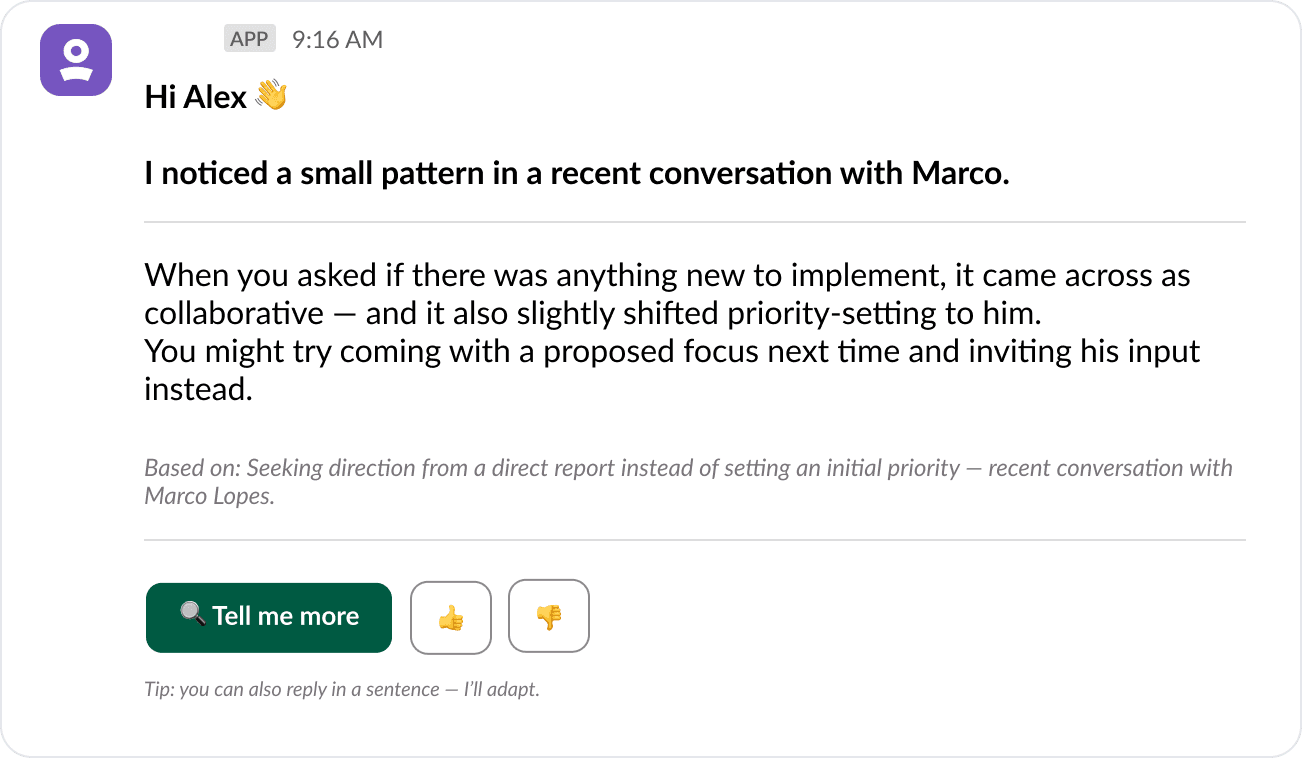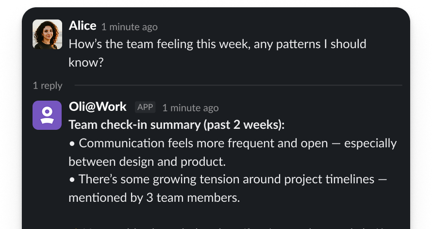 Managers needed signals turned into calm, actionable insights inside Slack — without another dashboard or context switch.