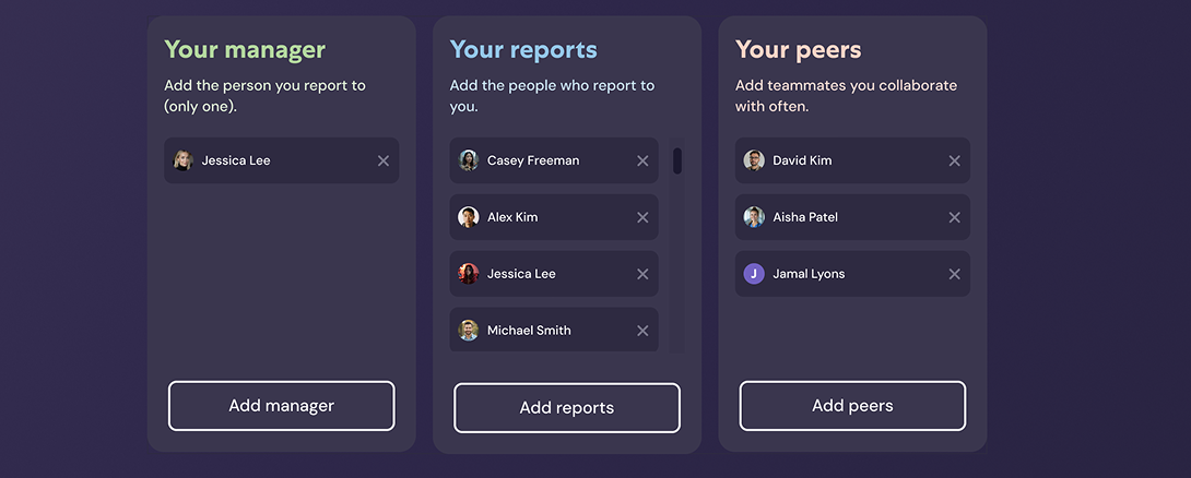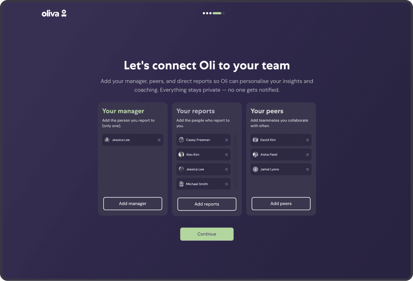 A lightweight setup flow to connect managers, direct reports, and peers — giving Oli the relational context it needs to personalise insights and coaching.