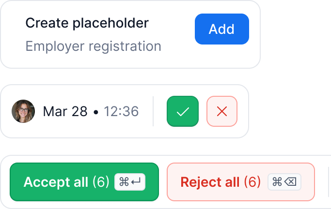 Lawyers can review the draft directly in place, ask AI for clause-level improvements, and accept or reject changes individually — while keeping full control over the final document.