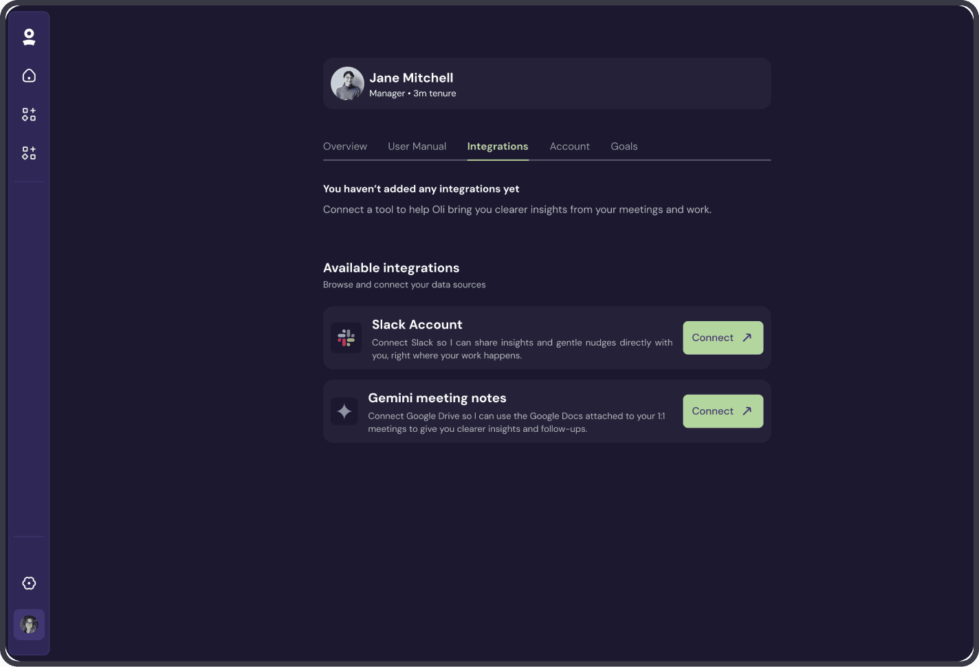 Connect tools like Slack and Google Drive so Oli can bring clearer insights from meetings and work—with clear status and available integrations.