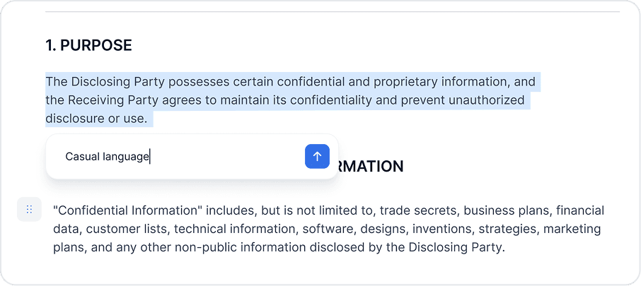 Once the draft is created, the document behaves like any other legal text. Users can format, restructure, and edit directly — or ask AI to improve specific sections without losing control of the content.